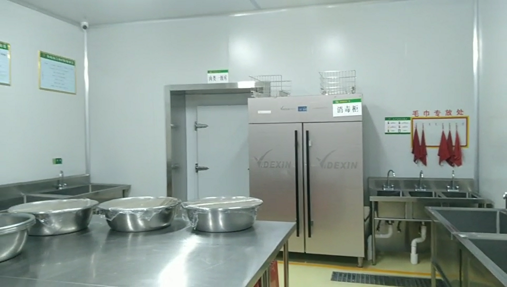 設(shè)備:單星水池、新興榮福全自動洗箱機、洗碗機、新興榮福高溫?zé)犸L(fēng)循環(huán)消毒庫、沖地龍頭等。