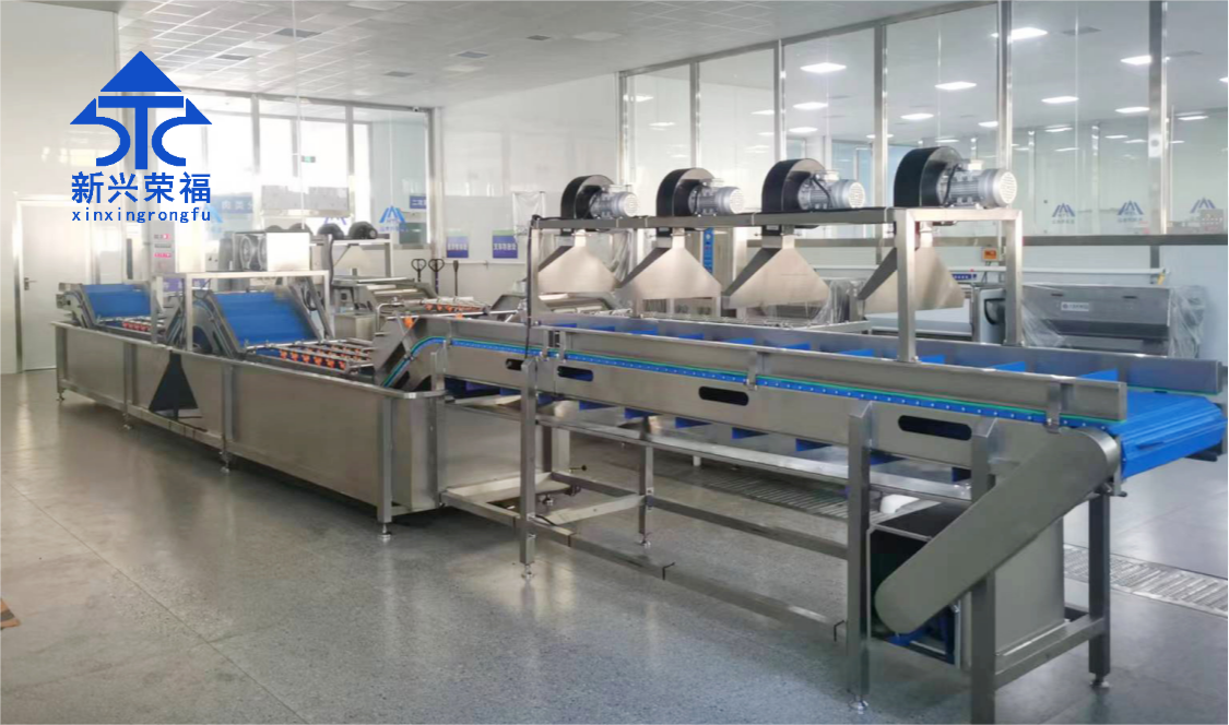 該項目采用的新興榮福蔬菜清洗線設備,包括含有六工位挑選輸送機、多功能切菜機、快速拆裝型提升機、水流式渦輪清洗機(高缸)、水流式渦輪清洗機(低缸)、震動瀝水機等。